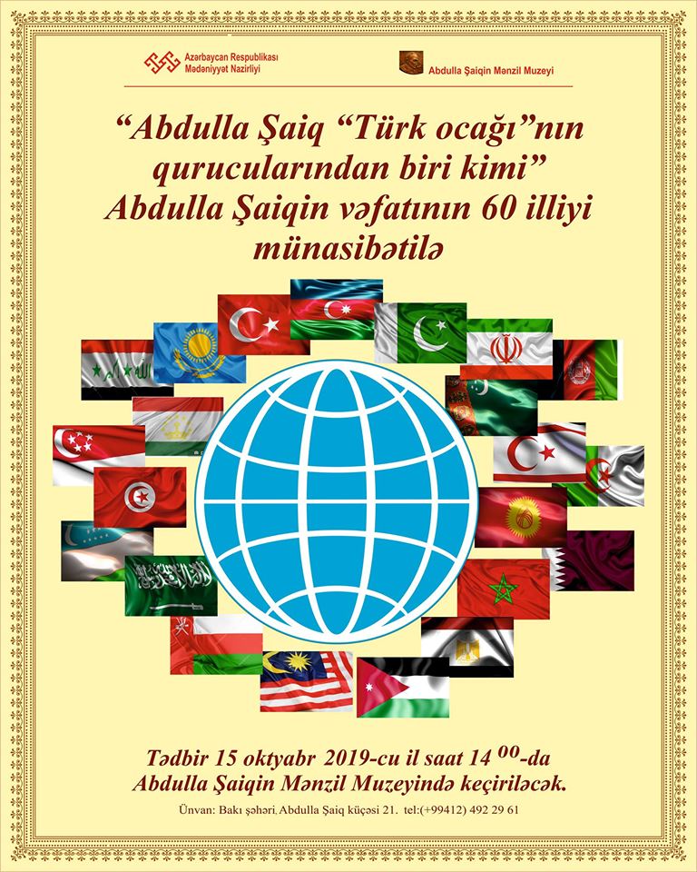 15 oktyabr 2019-cu il saat 14:00-da Abdulla Şaiqin Mənzil Muzeyində ədibin vəfatının 60 illiyinə həsr edilmiş tədbir keçiriləcək. “Abdulla Şaiq “Türk ocağı”nın qurucularından biri kimi” adlı tədbir Azərbaycanda bərpa edilmiş “Türk ocağı” ilə birgə təşkil edilib.