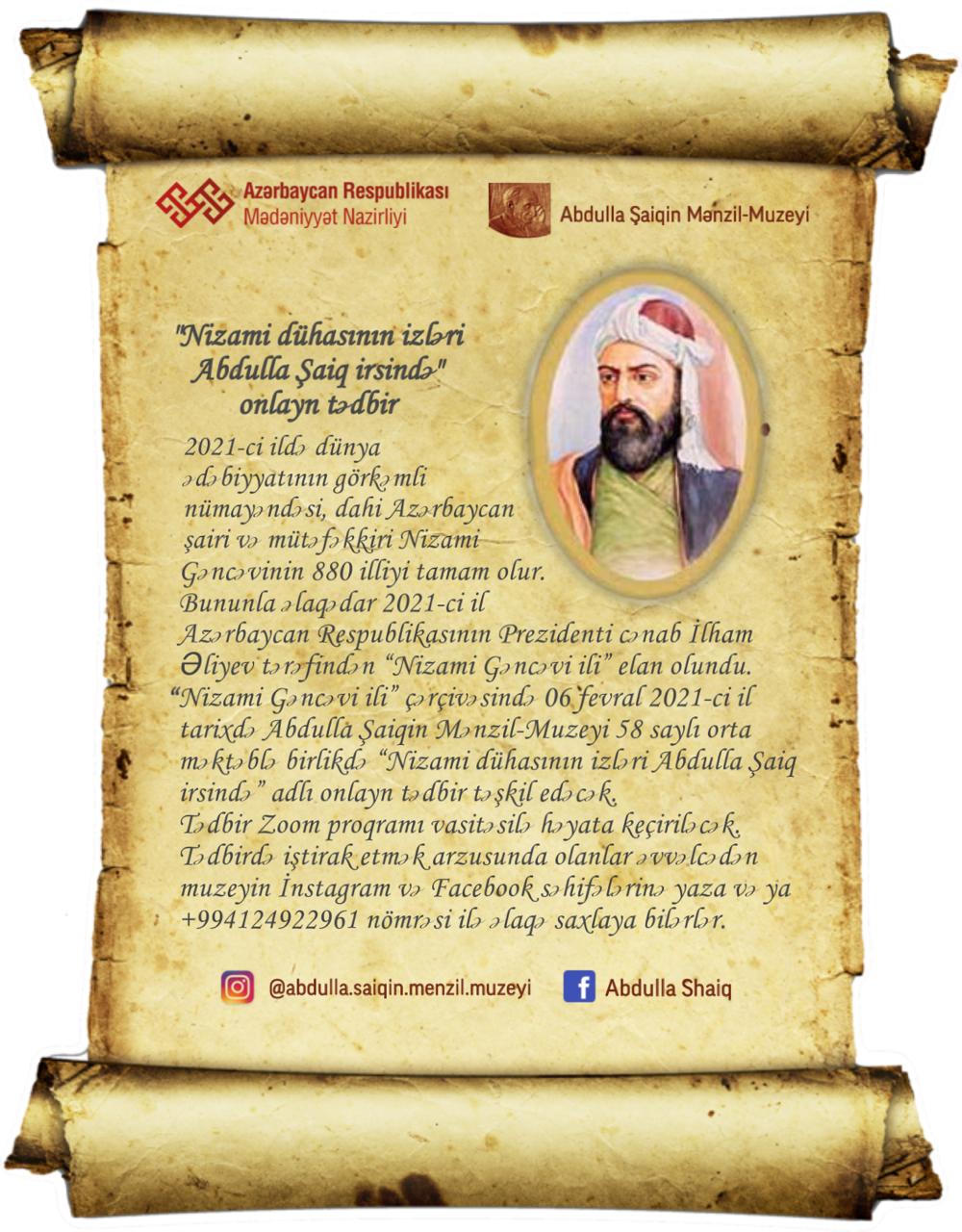 2021-ci ildə dünya ədəbiyyatının görkəmli nümayəndəsi, dahi Azərbaycan şairi və mütəfəkkiri Nizami Gəncəvinin 880 illiyi tamam olur. Bununla əlaqədar 2021-ci il Azərbaycan Respublikasının Prezidenti cənab İlham Əliyev tərəfindən “Nizami Gəncəvi ili” elan olundu. “Nizami Gəncəvi ili” çərçivəsində 06 fevral 2021-ci il tarixdə saat 14:00-da Abdulla Şaiqin Mənzil-Muzeyi 58 saylı orta məktəblə birlikdə “Nizami dühasının izləri Abdulla Şaiq irsində” adlı onlayn tədbir təşkil edəcək. Tədbir Zoom proqramı vasitəsilə həyata keçiriləcək. Tədbirdə iştirak etmək arzusunda olanlar əvvəlcədən muzeyin İnstagram və Facebook səhifələrinə yaza və ya +994124922961 nömrəsi ilə əlaqə saxlaya bilərlər.