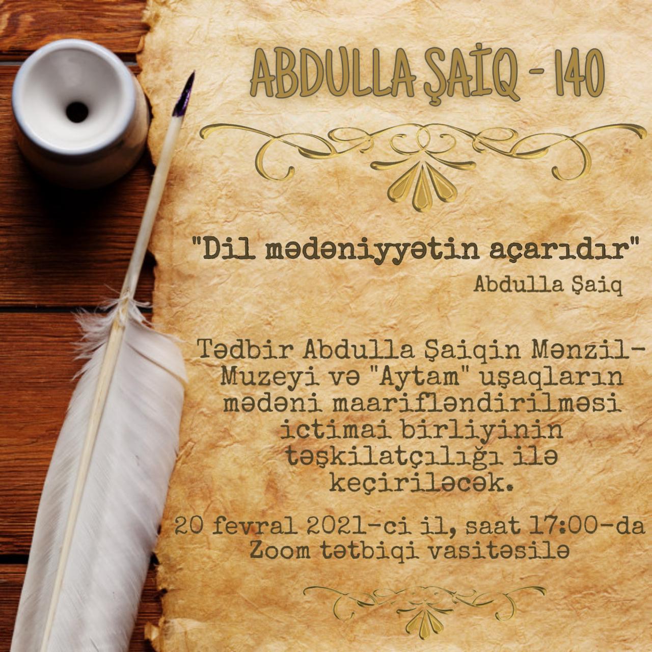 20 fevral 2021-ci il tarixdə saat 17:00-da Abdulla Şaiqin Mənzil-Muzeyi və “Aytam” Uşaqların Mədəni Maarifləndirilməsi İctimai Birliyinin təşkilatçılığı ilə Zoom tətbiqi vasitəsilə “Dil mədəniyyətin açarıdır” adlı tədbir keçiriləcək. Tədbir Abdulla Şaiqin 140 illik yubileyi tədbirləri çərçivəsində Beynəlxalq Ana Dili Gününə həsr edilmişdir.