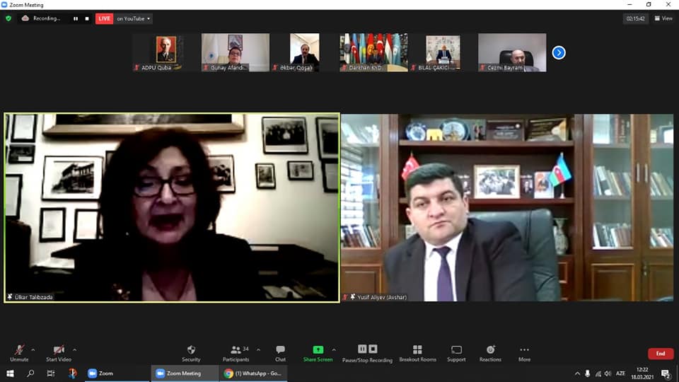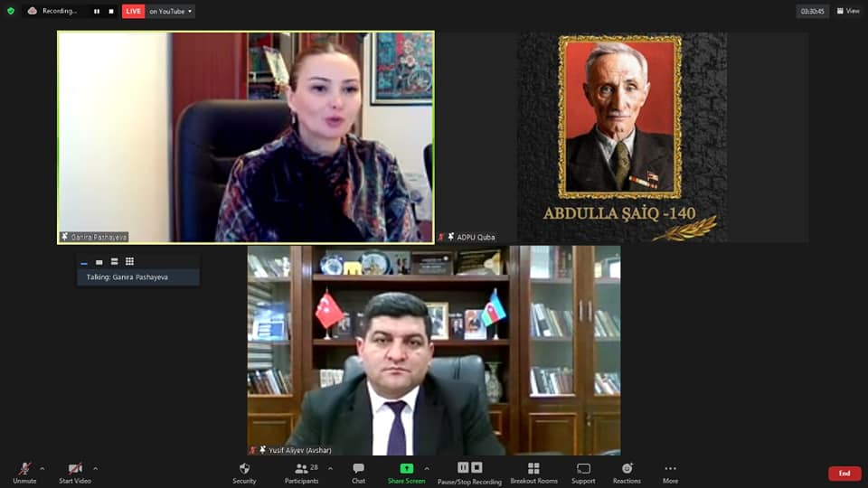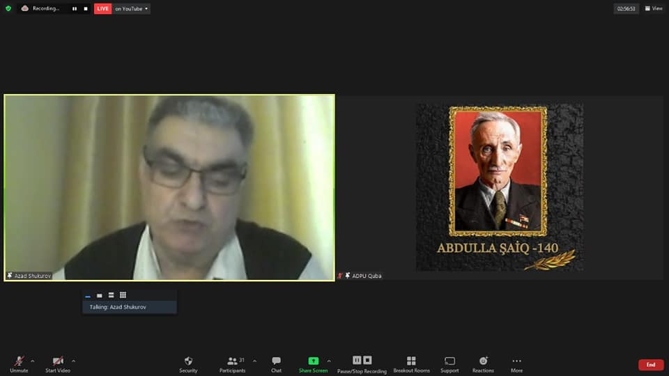 18 mart 2021-ci il tarixdə saat 11:00-da Türk dünyasının qüdrətli ədibi, Azərbaycan ədəbiyyatının klassiki, böyük maarif və ictimai-siyasi xadimi Abdulla Şaiqin 140 illik yubileyinə həsr edilmiş “Arazdan Turana” adlı Virtual konfrans (“Zoom” proqramı üzərindən) keçirildi. Konfrans Azərbaycan Respublikasının Mədəniyyət Nazirliyi, Milli Məclisin Mədəniyyət Komitəsi, AMEA Nizami Gəncəvi adına Ədəbiyyat İnstitutu, Azərbaycan Yazıçılar Birliyi, Beynəlxalq Türk Mədəniyyəti və İrsi Fondu, TÜRKSOY və Beynəlxalq Türk Akademiyasının təşkilatçılığı ilə keçirildi. Konfransın təşkilində Abdulla Şaiqin Mənzil-Muzeyi, “Avrasiya Beynəlxalq Araşdırmalar İnstitutu” İB, “Regional Hüquqi və İqtisadi Maarifləndirmə” İB, Türk Ədəbiyyatı Vəqfi, Dünya Gənc Türk Yazarlar Birliyi və ADPU Quba filialı dəstək qurum qismində iştirak etmişlər. Konfransda Azərbaycan Respublikasının Mədəniyyət naziri Anar Kərimov, MM Mədəniyyət Komitəsinin sədri Qənirə Paşayeva, millət vəkili, Ədəbiyyat İnstitutunun direktoru akademik İsa Həbibbəyli, Xalq yazıçısı, Azərbaycan Yazıçılar Birliyinin sədri Anar, Beynəlxalq Türk Mədəniyyəti və İrsi Fondunun prezidenti Günay Əfəndiyeva, Beynəlxalq Türk Akademiyasının prezidenti akademik Darhan Kıdırali, TÜRKSOY Baş katibinin müavini Bilal Çakıcı, Abdulla Şaiqin Mənzil-Muzeyinin direktoru Əməkdar mədəniyyət işçisi dos.dr Ülkər Talıbzadə, Regional Hüquqi və İqtisadi Maarifləndirmə İctimai Birliyinin nümayəndəsi Arzu Bağırova, Türk Ocaqları İstanbul şöbəsinin Başqanı dr. Cezmi Bayram, Azərbaycan Türk Ocaqları Başqanı dr. Akif Aşırlı, ADPU Quba filialının direktoru Dos.dr. Yusif Alı Afşar iştirak etdilər. Konfransda Abdulla Şaiqin çoxşaxəli yardıcı fəaıiyyətinin müxtəlif istiqamətləri ilə bağlı alimlərimiz maraqlı məruzələr təqdim etdilər. “Abdulla Şaiq. Həyatı. Yaradıcılığı” mövzusunda filologiya elmləri doktoru Cavanşir Yusiflinin, “Abdulla Şaiq və Türkçülük” – filologiya üzrə fəlsəfə doktoru, dosent Təranə Turan Rəhimlinin, “Abdulla Şaiq – ədəbiyyatşünas” – filologiya üzrə fəlsəfə doktoru Arzu Hacıyevanın, “Abdulla Şaiq və teatr” – tarix elmləri doktoru Minaxanım Əsədovanın, “Abdulla Şaiqin uşaq yaradıcılığı” – filologiya üzrə fəlsəfə doktoru, dosent Aygün Bağırlının, “Abdulla Şaiqin pedaqoji fəaliyyəti” – pedaqoji elmlər doktoru, professor Fərrux Rüstəmovun çıxışları dinlənildi. Əməkdar artist Azad Şükürov Şaiqin “Arazda Turana” əsərini səsləndirdi.