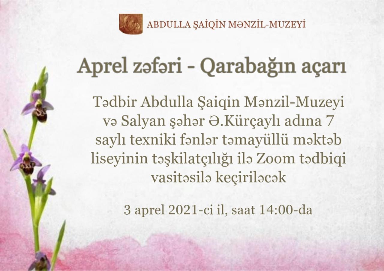 3 aprel 2021-ci il tarixdə saat 14:00-da “Aprel zəfəri – Qarabağın açarı” adlı onlayn tədbir keçiriləcək. Tədbir Abdulla Şaiqin Mənzil-Muzeyi və Salyan şəhər Ə.Kürçaylı adına 7 saylı texniki fənlər təmayüllü məktəb liseyin birgə təşkilatçılığı ilə Zoom tətbiqi vasitəsilə baş tutacaq. Tədbirə qoşulmaq üçün linkimiz: https://us05web.zoom.us/j/2148613814?pwd=cWZsTm8vQnkzSndBdy9wYUFPNW1lQT09