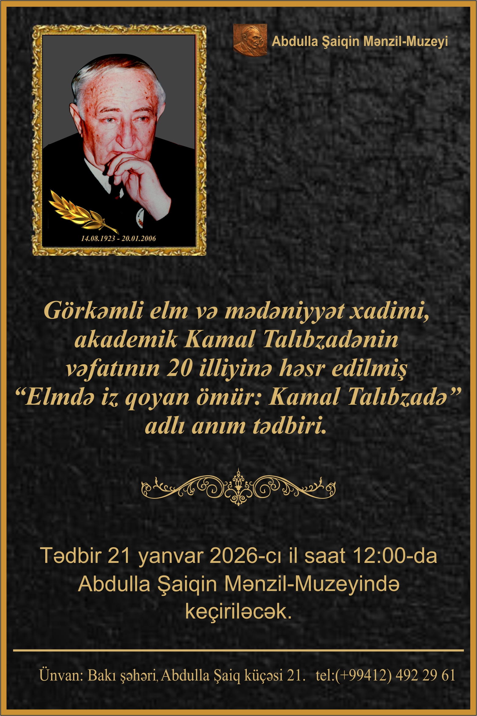 21 yanvar 2026-cı il tarixdə saat 12:00-da Abdulla Şaiqin böyük oğlu, görkəmli ədəbiyyatşünas-alim, akademik Kamal Talıbzadənin xatirəsinə həsr olunmuş “Elmdə iz qoyan ömür: Kamal Talıbzadə” adlı anım tədbiri keçiriləcək. Kamal Talıbzadə 20 yanvar 2006-cı ildə vəfat edib. Vəfatının 20 illiyi münasibətilə Abdulla Şaiqin Mənzil-Muzeyində keçiriləcək tədbirdə alimin Azərbaycan ədəbiyyatşünaslığının inkişafındakı müstəsna xidmətləri, elmi irsi və milli mədəniyyətimizə verdiyi əvəzsiz töhfələr haqqında çıxışlar və xatirələr təqdim olunacaq.