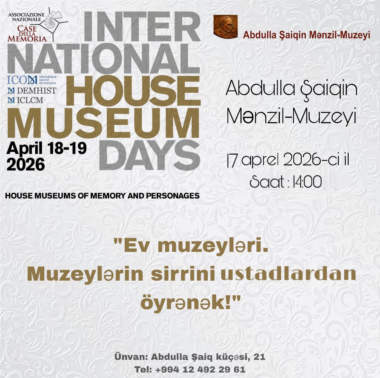 17 aprel 2026-cı il tarixdə saat 14:00-da Abdulla Şaiqin Mənzil-Muzeyində “Ev-muzeyləri – Muzeylərin sirrini ustadlardan öyrənək!” adlı maarifləndirici tədbir keçiriləcək. Tədbir, ev-muzeylərinin mədəni irsin qorunması və təbliğində rolunu diqqətə çatdırmaq, həmçinin muzey işi sahəsində təcrübə və bilik mübadiləsini təşkil etmək məqsədi daşıyır.