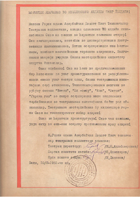 Greetings by the staff of the Young Spectators Theatre on the occasion of the 70th anniversary of Abdulla Shaig. |