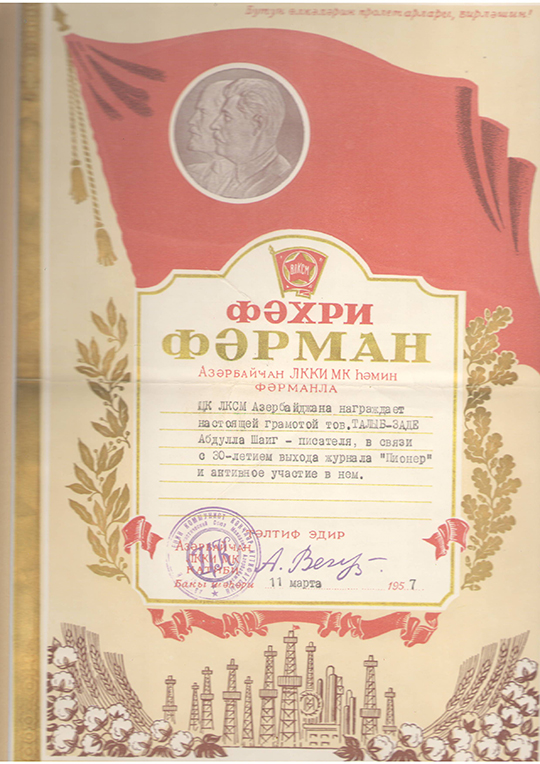 Abdulla Shaig was awarded with Honorary Diploma for his active participation in celebrating 30th anniversary of the “Pioneer” magazine. |