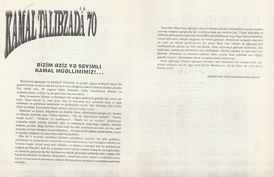 Was presented by the staff of the Institute of Literature on the occasion of the 70th anniversary of Kamal Talibzadeh. |