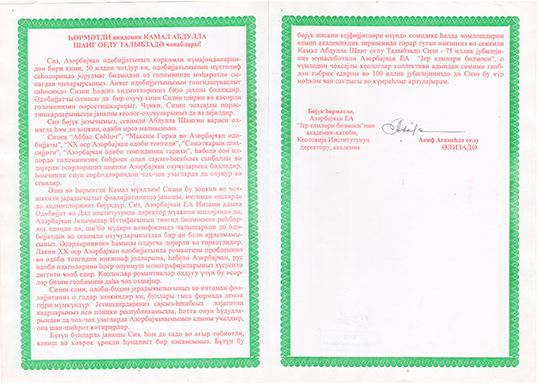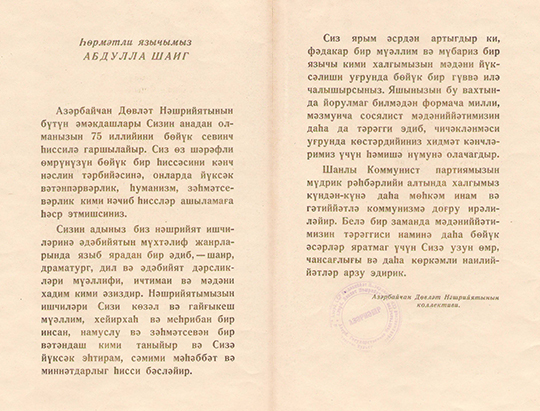 Greetings by the staff of the Azerbaijani State Publishing House “Azerneshr” on the occasion of the 75th anniversary of Abdulla Shaig. |