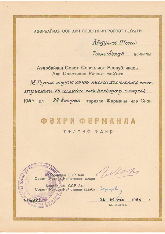 Honorary Diploma presented to Abdulla Shaig by the Presidium of Verkhovny Sovet (Supreme Council) of the Azerbaijani Republic on the occasion of the 25th anniversary of the Young Spectators Theatre named after Maxim Gorky. |