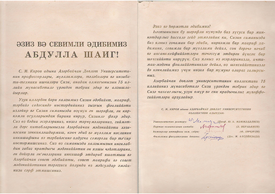 Greetings by the staff of the Azerbaijani State University on the occasion of the 75th anniversary of Abdulla Shaig. |