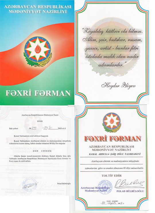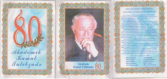 Was presented by the Department of New Literature on the occasion of the 80th anniversary of Kamal Talibzadeh. Baku, 26 November 2003. |