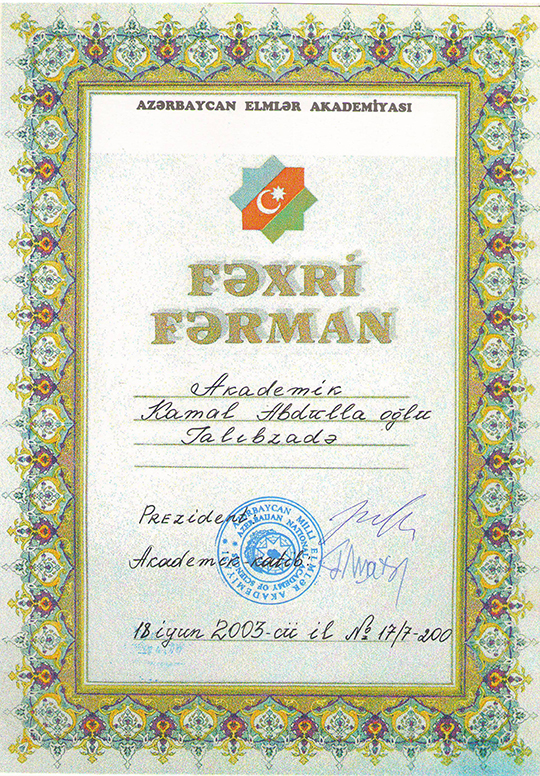 Honorary Diploma presented by the President of the Academy of Science of Azerbaijan Mr. Faramaz Magsudov and secretary academician Bakir Nabiyev. Baku, 18 June 2003. |