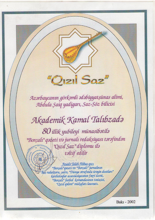 Diploma “Qızıl Saz” (Golden Saz) on the occasion of the 80th anniversary of Kamal Talibzadeh. Baku, 2002. |