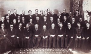 Abdulla Shaig with his fellow teachers and renown students. On the corners of the photo the message in Arabic and Cyrillic alphabets reads: To much respected and dear Abdulla Shaig Talibzade, a souvenir from his students whom he taught for many years. 5/I.1958. (prominent academicians, scientists, composers etc.)